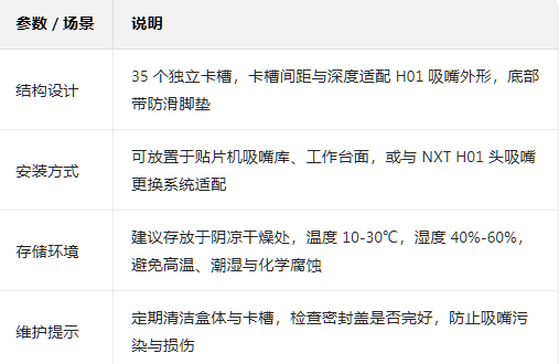每个吸嘴位采用专用卡槽设计,与 H01 吸嘴尺寸精准匹配,防止吸嘴晃动、磕碰,保护吸嘴头部与杆部精度。