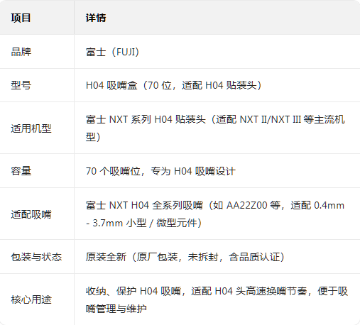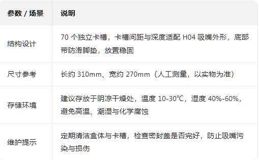 :70 个独立卡槽与 H04 吸嘴尺寸精准匹配,误差≤0.05mm,防止吸嘴晃动、磕碰,保护吸嘴头部与杆部精度。
