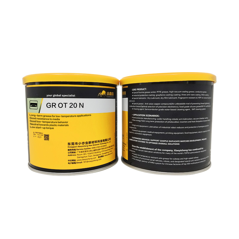 产品名称:XYC GR OT 20 N 品牌:XYC 小亦虫类型:基于低粘度全氟聚醚油(PFPE)与聚四氟乙烯(PTFE)增稠剂的白色无味低温长效润滑脂,专为低温环境下的长寿命润滑需求设计,即使在极低温度下也能提供优异的滑动摩擦性能核心定位:适用于-50°C 至 70°C温度范围内的长寿命润滑应用,尤其适合需要低启动扭矩、极低摩擦值和减少粘滑现象的精密部件、机电执行器、小齿轮和密封件,对大多数塑料和弹性体呈中性,具备优异的化学惰性和低温稳定性
